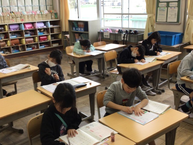 2年生書写では、1年間で学習したことを振り返りながら、丁寧に手本を見て書く練習をしました。自分の名前も漢字で書けるようになり、字も上手に書けるようになりました。