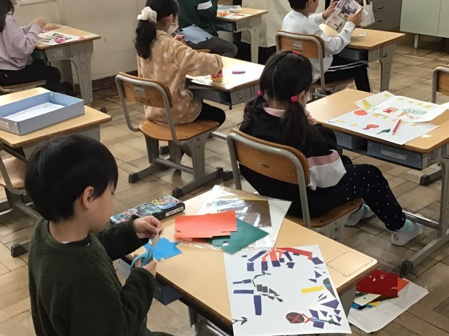 1年生図工「タックしき版画」では、下絵に合わせて色を決め、切り取りながら絵を完成させました。