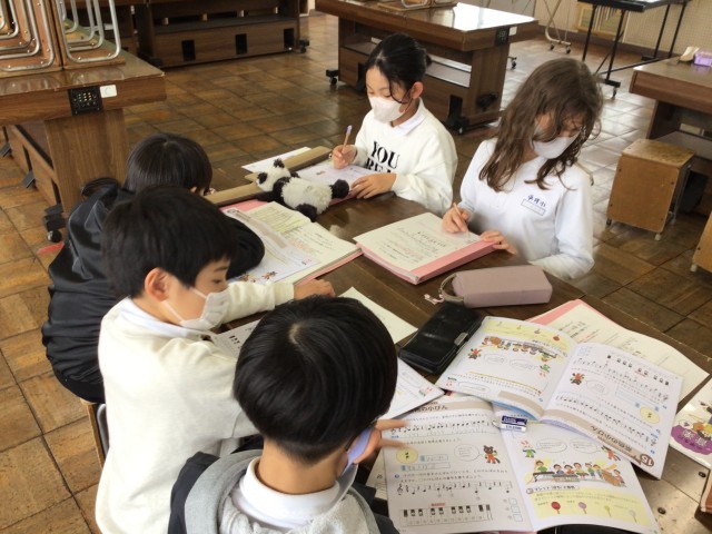 4年音楽では、校歌をリズムにのる場所となめらかに歌う部分があることなど学び、練習をしました。また、音楽ワークでシャープといった音楽記号や茶色の小びんにかかわることをまとめました。