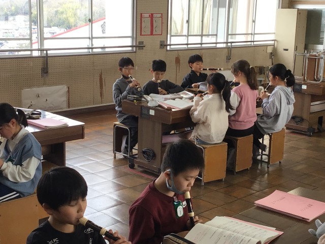 3/2 4年音楽2 公開日 2026/03/02 更新日 2026/03/02 各学年から 4年音楽では、「他パートの音を聴いて合奏しよう」というめあてで学習を進めていました。「エーデルワイス」や「茶色の小びん」を合奏しました。