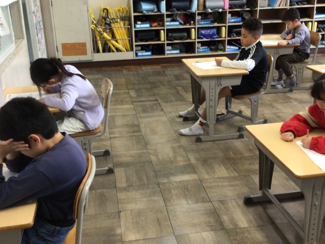 2年生算数では今まで習ったことのテストをしました。大きい数のテストで集中して取り組む姿が見られました。