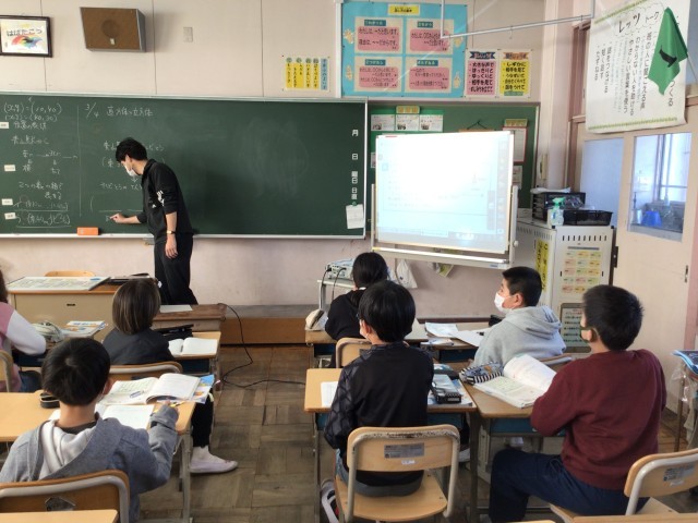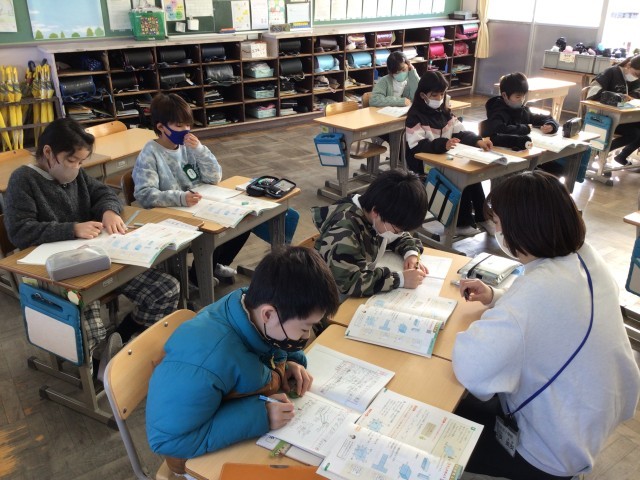 4年算数では、直方体と立方体の単元を学んでいます。「ビルの高さはどのように表すのだろうか」というめあてで、少人数で進めていました。