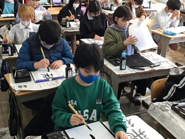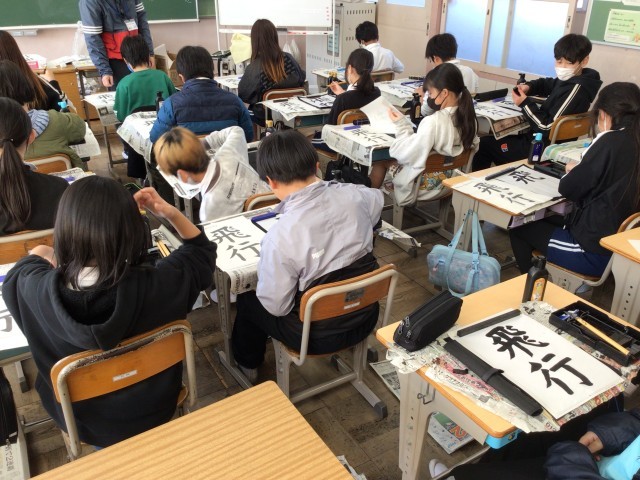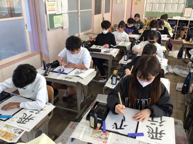 3/5 5年書写 公開日 2026/03/04 更新日 2026/03/04 各学年から 5年書写では、「用紙に合った文字の大きさに気をつけて書こう」というめあてで学習を進めていました。「飛行」という文字は画数が多いので、字の大きさだけでなく、バランスも難しいと思います。手本をよく見て書き上げていました。