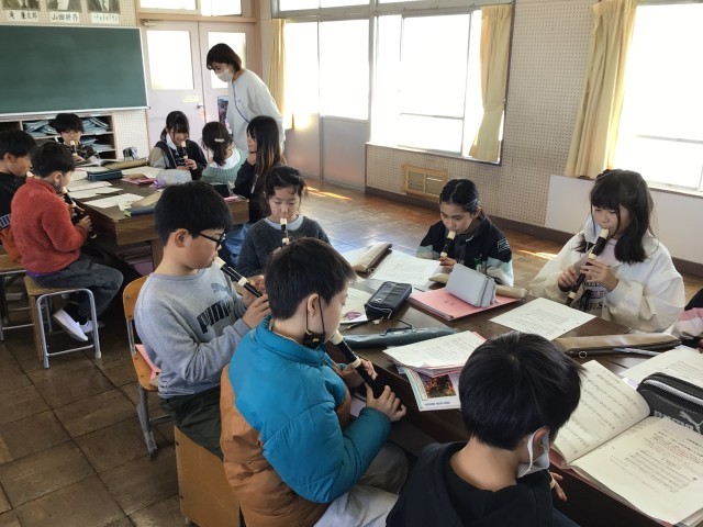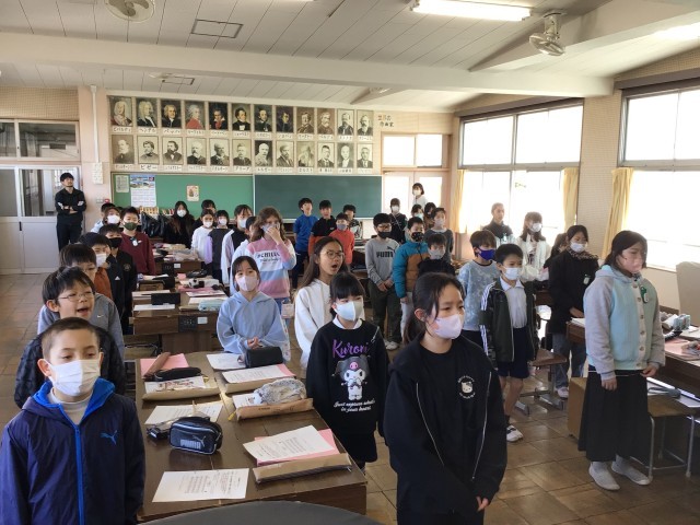 3/4 4年音楽 公開日 2026/03/04 更新日 2026/03/04 各学年から 4年音楽では、1・2組合同で実施し、「互いの音を聴いて合奏・合唱しよう」というめあてで学習を進めていました。強弱を意識しながら「赤いやねの家」を歌ったり、「もみじ」を合唱したりしました。また、「陽気な船長」「オーラ リー」「エーデルワイス」を音の重なりを感じながら吹きました