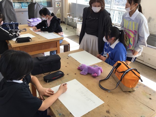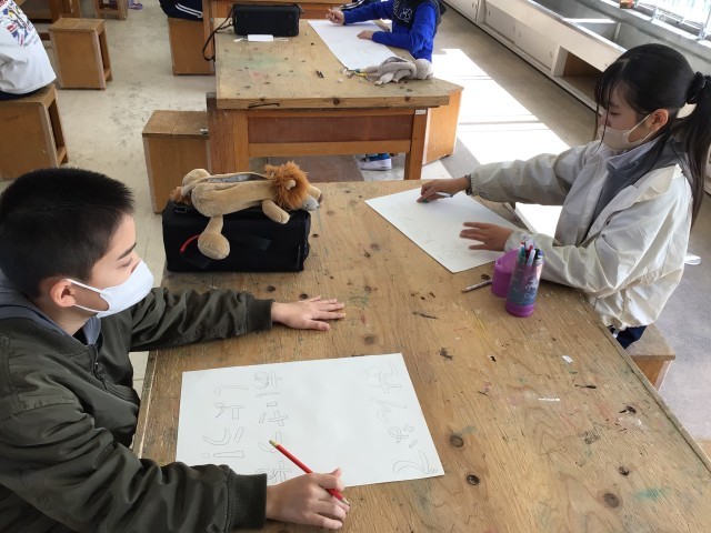 5年図工では、高橋地区あいさつ運動のポスターづくりをしています。文字を目立つように配置するなど、工夫をしながら下書きをしていました。