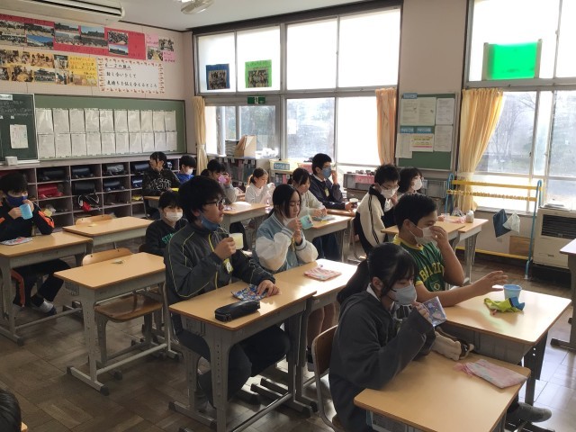 3/6 フッ化物洗口 公開日 2026/03/06 更新日 2026/03/06 各学年から 毎週金曜日の朝はフッ化物洗口の日です。今日も係の子が「ミュージック、スタート!」と言って、曲を流して始めていました。リズミカルな曲に合わせて、ブクブク口内洗浄を行いました。