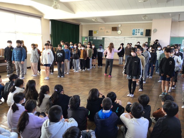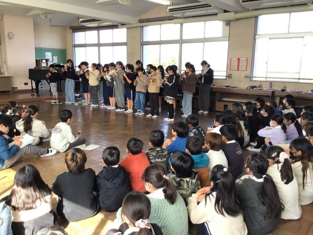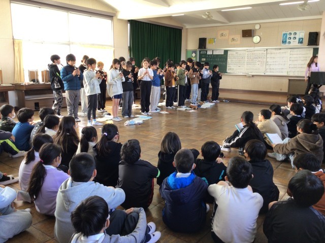 3/6 5年音楽 公開日 2026/03/06 更新日 2026/03/06 各学年から 5年音楽では、1・2組合同で行い、「友だちのよいところを見つけよう」というめあてで学習を進めていました。互いの演奏を聴き合い、それぞれの学級のよいところを見つけ発表したり、ワークシートに記入をしたりしていました。後半は4年生の前でリコーダー合奏「威風堂々」と「マイバラード」の合唱を行いました。