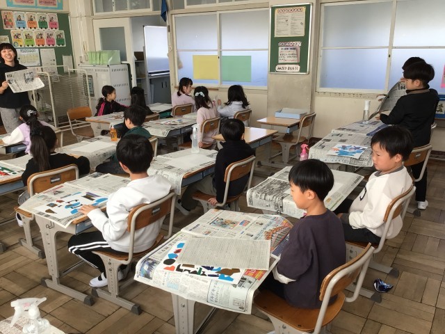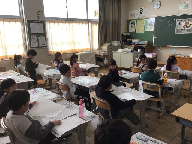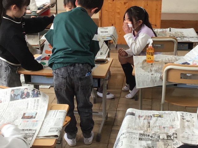 1年生は、紙版画を作り、今日は刷ってみました。ペアで、印刷する紙を霧吹きで濡らし、新聞紙で水を吸い取ります。うまく刷りあがるかたのしみですね。