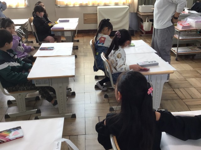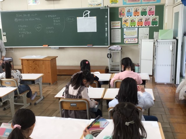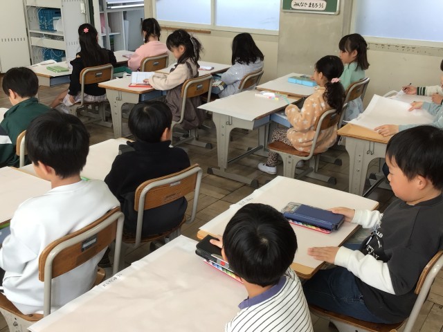 3/13 1年生図工 公開日 2026/03/13 更新日 2026/03/13 各学年から 1年生は図工で「作品思い出バック」を作りました。今までの作品をこのバックに入れます。バックの表裏に、自分の好きなものや、好きな食べ物、自分や友だちなどを色鉛筆で描きます。
