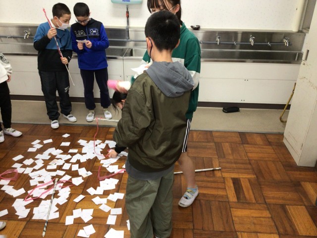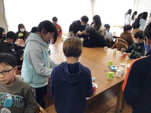 3/13 4年総合 公開日 2026/03/13 更新日 2026/03/13 各学年から 4年生が総合の時間の中で計画・立案したプロジェクトを太陽の時間に実施していました。多くの子どもたちがランチルームに 来室して、4年生が準備したゲームやワークショップで楽しんでいました。