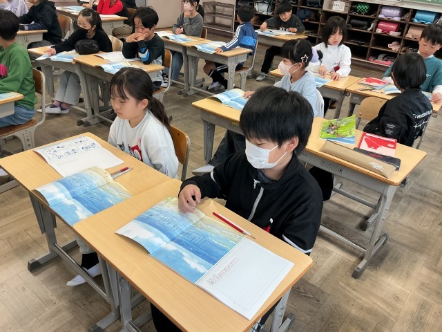4/10 4年国語 公開日 2026/04/10 更新日 2026/04/10 各学年から 4年国語では、水平線という詩について「リズムよく詩を読もう」というめあてで学習を進めていました。タイトルに出てくる水平線って何だろうということで、教科書の絵をみてどこのことなのかをまず考えていました。大人が何気無く使っている単語でも、子どもたちは意外と知らないものがたくさんあるので、きちんと学習をしていきます。
