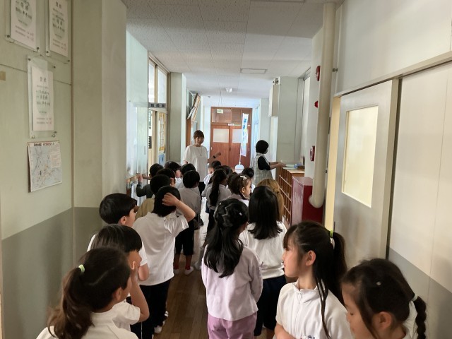 4/16 1年生活 公開日 2026/04/16 更新日 2026/04/16 各学年から 1年生活では、学級の係を決めた後、校内の探検をしました。3枚目の写真は南舎1階廊下で職員室と校長室について説明を聞いている場面です。