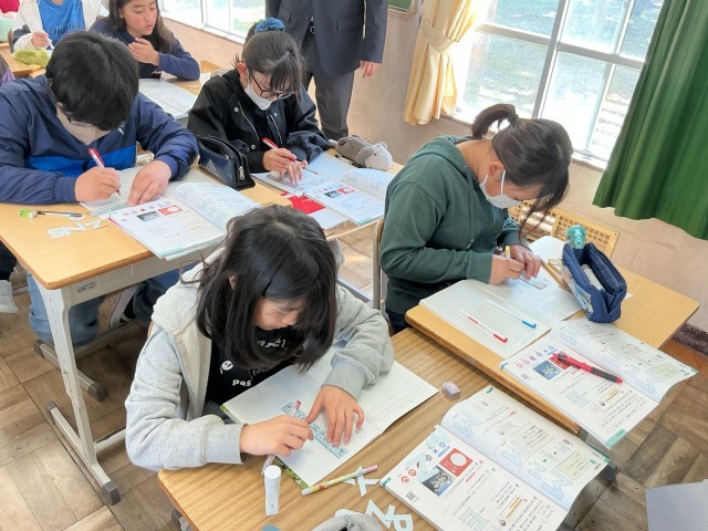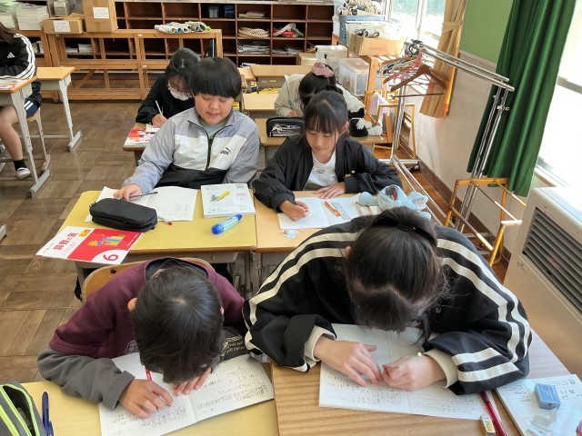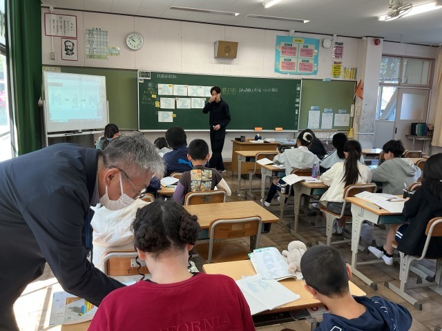6年算数では、対称な図形の単元を少人数で学んでいました。折ると重なる図形、線対称について学習をしていました。対称の軸がどこになるのか、実際に紙を折って確認していました。