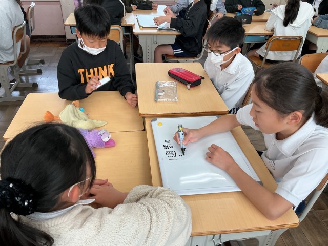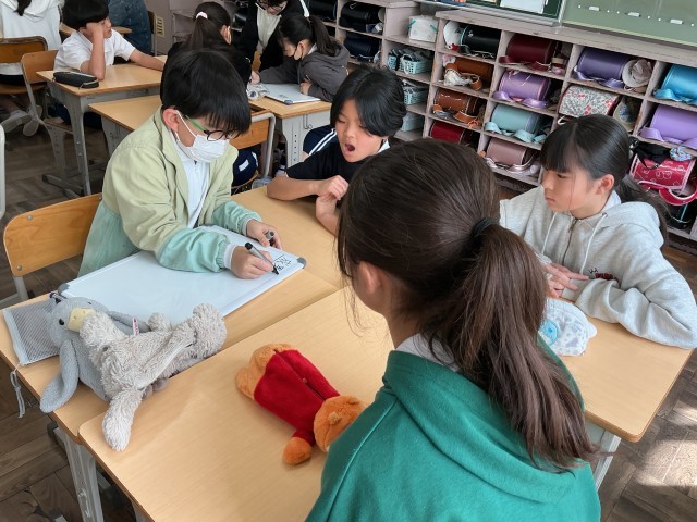 6年学活では、「1週間の6ー2を振り返ろう」というめあてでした。班で自分たちの生活を振り返り、成果と課題について話し合ったことや出てきた意見をホワイトボードに書き込んでいました。