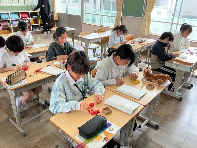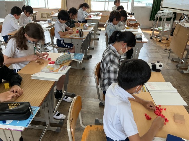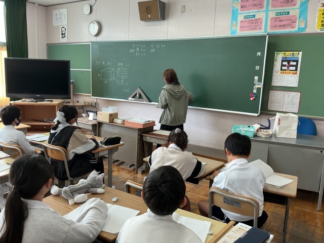 5年算数では、体積の単元に入り、少人数で学んでいました。「1辺が1cmの立方体を重ねてかさを調べよう」というめあてで学修を進めていました。