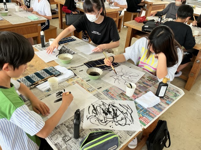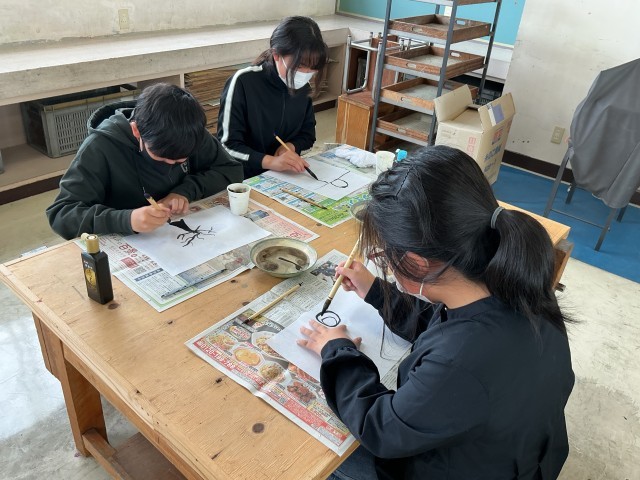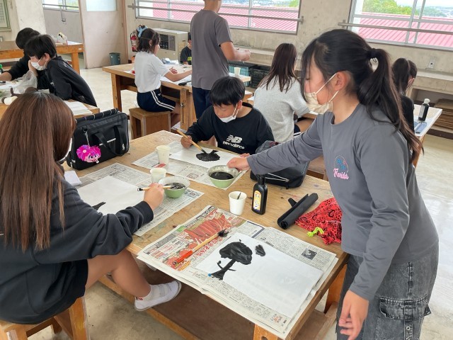 4/20 6年図工 公開日 2026/04/20 更新日 2026/04/20 各学年から 6年図工では、墨と水から広がる世界という作品づくりをしました。墨と水でできる形や色から特徴を捉え、さまざまな表現を味わおうというものです。これまでの書写とは違った筆の線などを見ながら、作品づくりを進めていました。