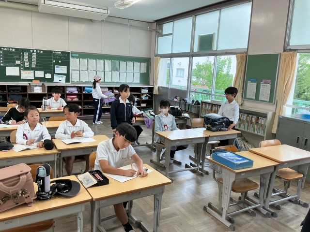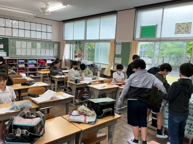 外はどんよりした天気ですが、教室では友達とも会話も弾みとても明るい声が聞こえてきました。翌日の連絡を記入したり、提出物を出したりするなど、朝の支度を進めていました。