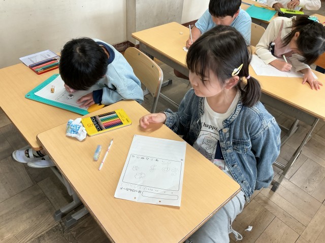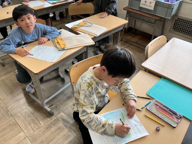 4/21 2年生活1 公開日 2026/04/21 更新日 2026/04/21 各学年から 2年生活科では、外へ出て観察をした春の植物について「はっけんカード」に絵を描いています。今日は色を塗って完成させ、先生にチェックしてもらっていました。