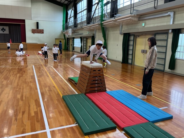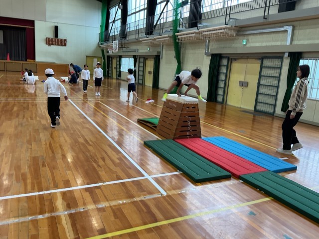4年体育では、跳び箱の練習をしていました。段数を変えたコースごとで前回に引き続き練習を行っていました。台上で手をつく場所、跳ぶタイミングなどを考えながら練習をしていました。