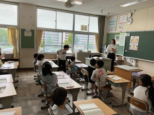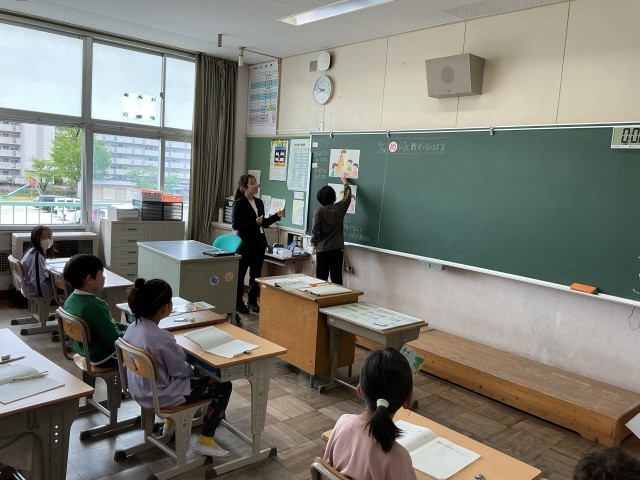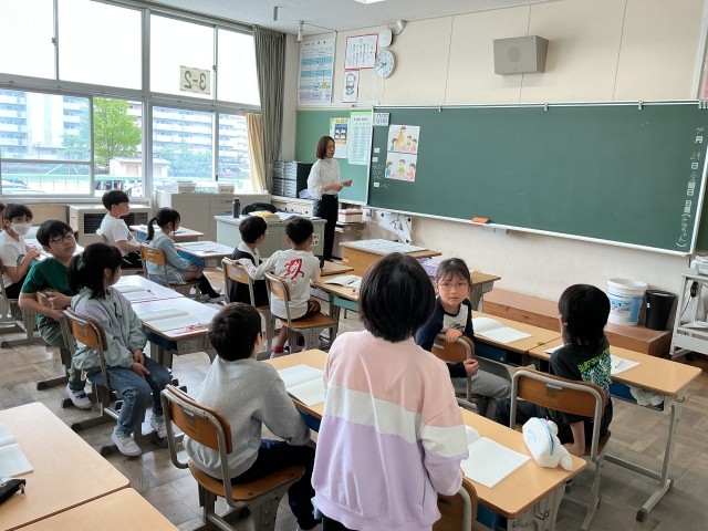 3年算数では、わり算の単元に入りました。黒板に掲示したイラストを見ながら、気づいたことをみんなで確認した後、「同じ数ずつ分けよう」というめあてで学習を進めていました。おうちの方がたくさん参観されていて、緊張した表情の子もいました。
