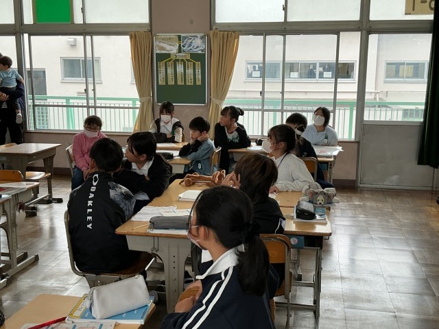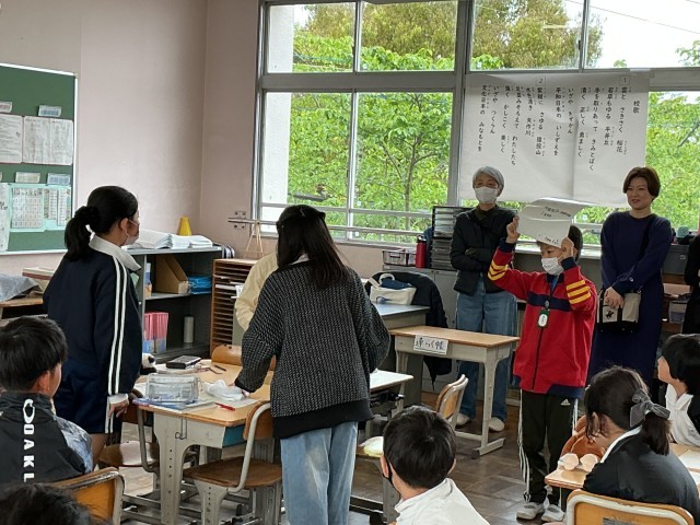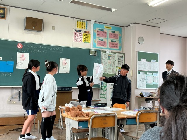 5年算数では、体積の単元を学んでいます。「ソファー型の体積を工夫して求めよう」というめあてで学習を進めていました。班ごとで考え方を話し合い、みんなの前で発表を行っていました。