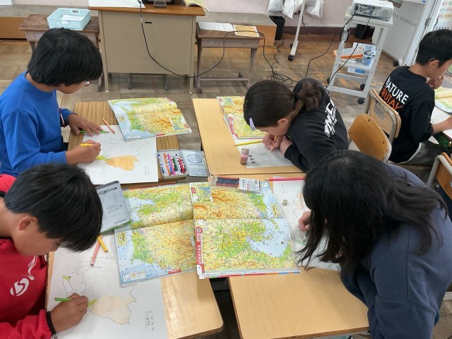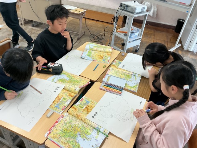 4/27 4年社会 公開日 2026/04/27 更新日 2026/04/27 各学年から 4年社会では、どちらの学級も郷土の地理を学んでいます。「愛知県の土地の様子を調べよう」というめあてで、白地図に色を塗っていました。