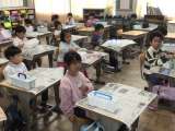 1年生図工で「絵の具の使い方」を学習しています。絵の具セットの水入れを出したり、...