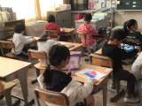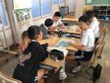 1年生図工「海の中の世界をつくろう」では、魚の色を塗り、まわりをクレヨンで描きま...