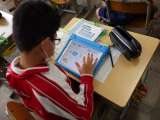 3年生が国語の授業で年賀状を書いています。 文章だけでなく、学習用タブレットを...