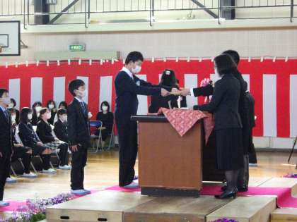 今年は、新型コロナウイルス感染防止のため、来賓や在校生は参加せずに、卒業生と保護者、教職員、そして在校生の代表児童のみの参加でした。