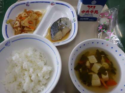 4月13日の給食は、すまし汁、ちらしずし、さわらの照り焼き、花見団子、牛乳でした。13日は、花見献立ということで、ちらしずしと花見だんごが出ました。さわらも季節の食材として照り焼きで美味しくいただきました。