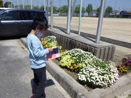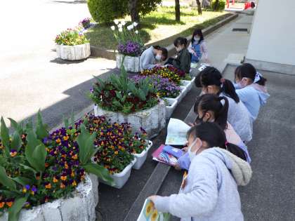 3年生は、理科の学習「しぜんのかんさつ」ということで、チューリップなど花の観察をしていました。今、学校では、色とりどりの花が咲いています。3年生の子たちも「どの花を描こうかな〜」と、迷っていました。