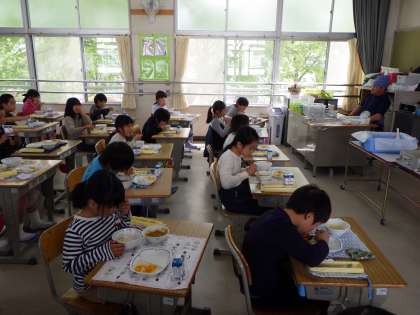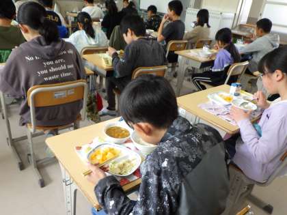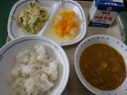 4月23日の給食は、カレーライス、チキンサラダ、ミックスフルーツ、麦ごはん、牛乳でした。子どもたちの大好きなカレーにミックスフルーツ、そして、チキンサラダまで出て、みんな大喜びで食べていました。
