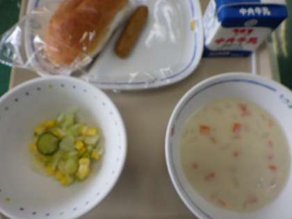 5月14日の給食は、お豆のポタージュ、コーンサラダ、ウインナー、米粉パン、牛乳でした。米粉パンは、豊田産のお米「大地の風」から作られています。もっちりとしていてとても美味しかったです。