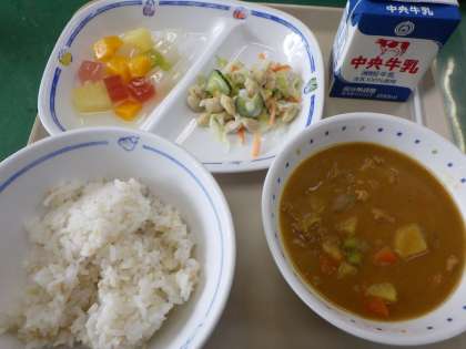 5月20日の給食は・・・ 公開日 2021/05/21 更新日 2021/05/21 お知らせ 5月20日の給食は、カレーライス、麦ごはん、ビーンズサラダ、フルーツポンチ、牛乳でした。学校のカレーは、甘くてとろみがあって子どもたちからも大人気のメニューです。今日も美味しくいただきました。