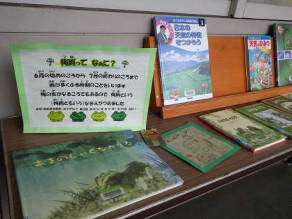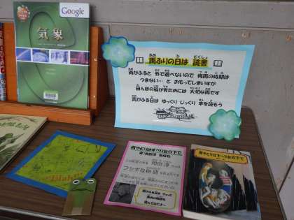 こちらは、図書室前の廊下の掲示物です。地域学校共働本部の図書館ボランティアさんたちが作ってくださいました。梅雨の季節の読み物や「梅雨ってな〜に!」ということで、梅雨の説明をわかりやすくしてくださるなど、子どもたちが興味をもてるようさまざまな工夫をしてくださっています。
