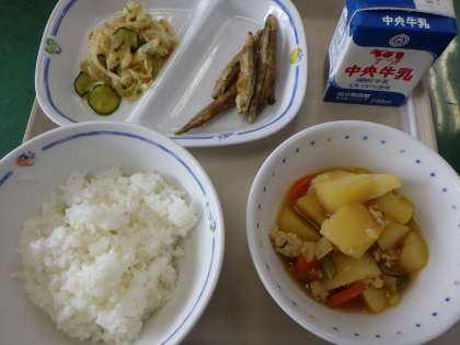 6月8日の給食は・・・ 公開日 2021/06/09 更新日 2021/06/09 お知らせ 6月8日の給食は、じゃがいものそぼろ煮、ごま酢あえ、きびなごのかりん揚げ、ごはん、牛乳でした。きびなごのかりん揚げは、甘辛いたれが中までしっかりしみこんでいてとても美味しかったです。