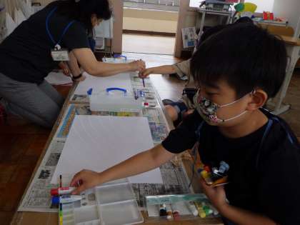 特別支援学級では図工を 公開日 2021/06/18 更新日 2021/06/18 各学年から 特別支援学級の教室をのぞいてみると、ちょうど図工をしていました。今日は、画用紙に水彩絵の具で虹を描く学習です。上手に塗れるといいね。