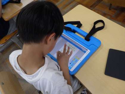 お隣の特別支援学級では、タブレットの授業を行っていました。取り扱いにも慣れて、一人ですいすいやっていました。