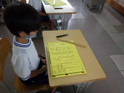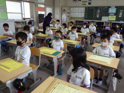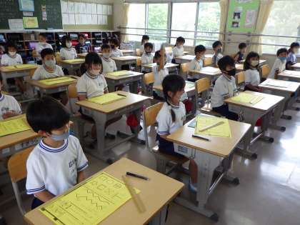 2年生の教室をのぞいてみると、図工の授業でカッターナイフの使い方を学習するところでした。みんなものすごく姿勢がよく、先生の注意をしっかり聞いていました。これなら、カッターナイフを安全に使えそうですね。