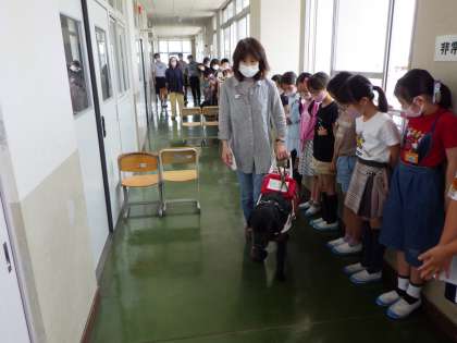 6月24日(木)の3・4時間目に社会福祉協議会の方をお招きし、3年生が盲導犬学習を実施しました。盲導犬のビリーと飼い主さんが障害物のある廊下を実際に歩く姿を見たり、盲導犬の仕事中の様子やハーネスを外したときの様子について詳しく話を聞いたりしました。盲導犬を実際に見ることができ、子どもたちにとってはとても貴重な経験となりました。