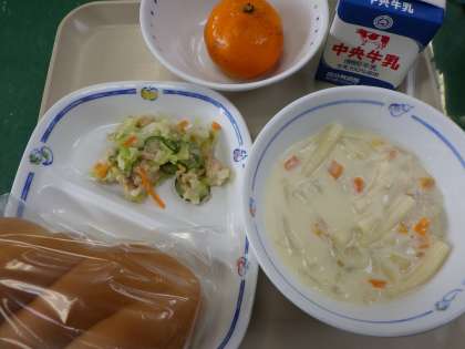7月9日の給食は、マカロニのクリーム煮、ツナサラダ、ツイストパン、冷凍みかん、牛乳でした。冷凍みかんは、とっても甘くて今日のような蒸し暑い日には最高の献立でした。