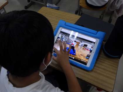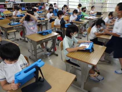 3年生の教室では、タブレットを使って学習をしていました。先生が、「今日は、学習ノートを4枚作って」と指示があると、子どもたちは、すいすいっと操作してあっという間に作っていました。もう慣れたもんですね。