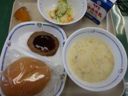 9月10日の給食は・・・ 公開日 2021/09/10 更新日 2021/09/10 お知らせ 9月10日の給食は、コーンチャウダー、コールスローサラダ、ハンバーガー(中濃ソースで)、プチゼリー、牛乳でした。本日は、アメリカの献立ということで、ハンバーガーが出ました。子どもたちも大喜びでした。