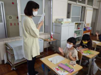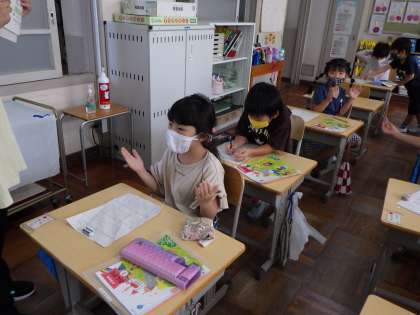 1年生の教室をのぞいてみると、音楽の授業をしていました。本日は、ボディパーカション。音楽に合わせて、手を叩いていました。緊急事態宣言中なので、歌ったりリコーダーを演奏したりすることを控えています。
