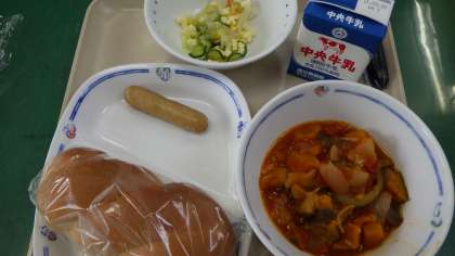 9月22日の給食は・・・ 公開日 2021/09/22 更新日 2021/09/22 お知らせ 9月22日の給食は、ラタトゥイユ、チーズサラダ、ウインナー、ツイストパン、牛乳、コーヒー牛乳の素でした。ラタトゥイユは、かぼちゃ、たまねぎ、なす、トマト缶、にんじん、ズッキーニなどいろいろな野菜が入っていてとても美味しかったです。ツイストパンもふわふわでした。