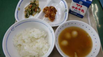 9月30日の給食は・・・ 公開日 2021/09/30 更新日 2021/09/30 お知らせ 9月30日の給食は、ワンタンスープ、とり肉のから揚げ、ナムル、ごはん、牛乳でした。とり肉のから揚げは、からっと揚がっていて今日も絶品でした。ナムルやワンタンスープもとても美味しかったです。