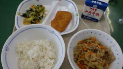 10月5日の給食は、豚丼、いり大豆あえ、いか香味あげ、麦ごはん、牛乳でした。いかの香味あげは、いかがたっぷり入っていてとても美味しかったです。豚丼はごはんにのせていただきました。