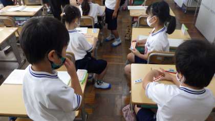 1年生では、算数の授業を行っていました。本日は、たし算(2)です。8+3=の答えの出し方をあれこれ考えていました。ペアになって、数図ブロックを使いながら自分の考えをはっきりと伝えていました。