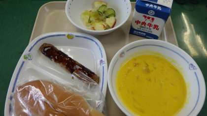 10月8日の給食は・・・ 公開日 2021/10/08 更新日 2021/10/08 お知らせ 10月8日の給食は、パンプキンポタージュ、りんごサラダ、ハンバーグドッグ(中濃ソース)サンドイッチロール、牛乳でした。ハンバーグドッグは、子どもたちも大好きで大喜びで食べていました。今日もバランス抜群の給食でした。